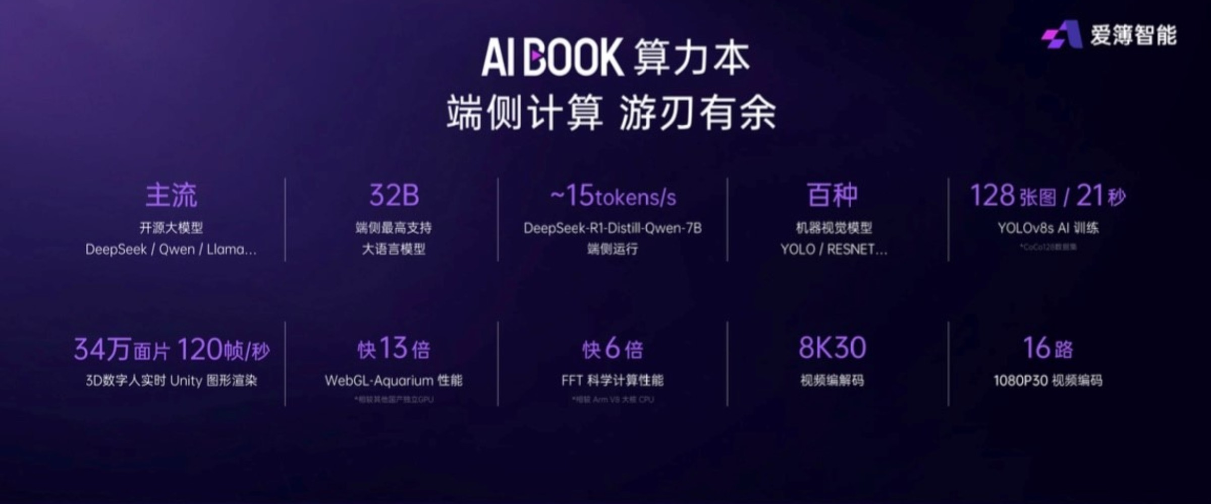 AIBOOK算力本在端侧算力、模型支持、图形渲染、科学计算和视频处理等方面展现出优异性能,全方位满足开发者需求: